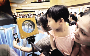 “簡直是惟妙惟肖,看畫的瞬間就像真的到了武隆!”市民拿出手中的相機、DV或手機記錄下來,有市民更是“站在”瀑簾中冒出來的石塊上,表情驚愕,頗有一番驚心動魄之感。