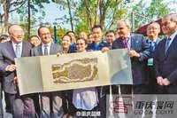 奧朗德先在多功能廳停留了大約十分鐘,觀看了該廠針對水廠環保節能方面的宣傳片,并多次詢問處理廠的運行情況。之后,奧朗德走到觀景臺,參觀了廠區全貌,并與陪同人員合影。最后,奧朗德參加為重慶德潤環境有限公司舉行的揭牌儀式。在參觀過程中,奧朗德還收到了一份見面禮:兩幅重慶地圖——《增廣重慶地輿全圖》和《重慶府治全圖》的復制品。其中,《增廣重慶地輿全圖》尤為珍貴,這是一幅100年前的重慶地圖卷軸,由清代實業家劉子如所畫。奧朗德雙手接過地圖時,向員工代表周安表示了感謝。