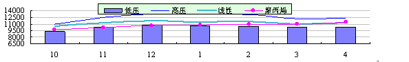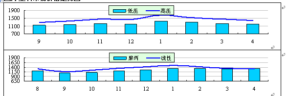 A、聚乙烯(PE):四月份月份國內大部分地區市場呈現三個分水嶺:上旬市場在外盤走低和需求疲弱的波及下低迷不振,價格回落了200-300元,其中高壓、線性跌勢偏強,成交遇阻;進入中旬,隨著石化企業聯手推價和低價入市增多,國內市場漸漸起色,價格順勢反彈了100-200元,市場成交未見同步放量;由于市場價格拉漲過速,下游抵觸氣氛濺起,價格一度滯漲僵持,成交不暢。 B、聚丙烯(PP):四月份國內大部分地區市場先跌后揚:上旬、中旬初市場行情因資源供應充裕和廉價遠洋貨的沖擊,以及聚乙烯市場不濟的影響而抑勢四起,價格回落了200元,成交稀少;進入中旬中、后期,受季節性需求旺季來臨和資源供應漸漸減少的提振,市場行情升溫,價格了400元,成交漸漸活躍;進入下旬,市場行情因價格推漲過激和市場需求跟進緩慢,下游難以承受高價而促發發抵觸情緒,價格進一步攀升遇壓,成交減緩。