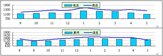 B、聚丙烯(PP):受市場資源供應(yīng)過于充裕和廉價遠(yuǎn)洋貨入侵,以及聚乙烯市場滑瀉和需求漸疲的沖擊,五月份國內(nèi)大部分地區(qū)市場抑勢彌漫,商家購買興趣缺失,跌聲濺起,降幅在500元左右,成交不暢。