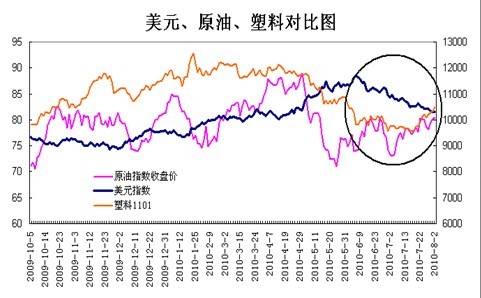 歐元債務危機逐漸淡出市場,美元指數反轉走跌,原油震蕩走強,對塑料價格形成支撐。美元由強轉弱標志著市場信心逐步恢復,避險需求意愿下降,市場風險偏好迅速回升。同時也表明市場對未來經濟預期也發生了明顯的好轉。美元的持續走跌將促進以美元計價的商品大幅走強,而各國長期維持低利率的貨幣政策在經濟轉暖后勢必引發高通脹,預計隨著經濟逐步趨于穩定原油價格在第三季度震蕩走強,對塑料價格將形成明顯的支撐作用。